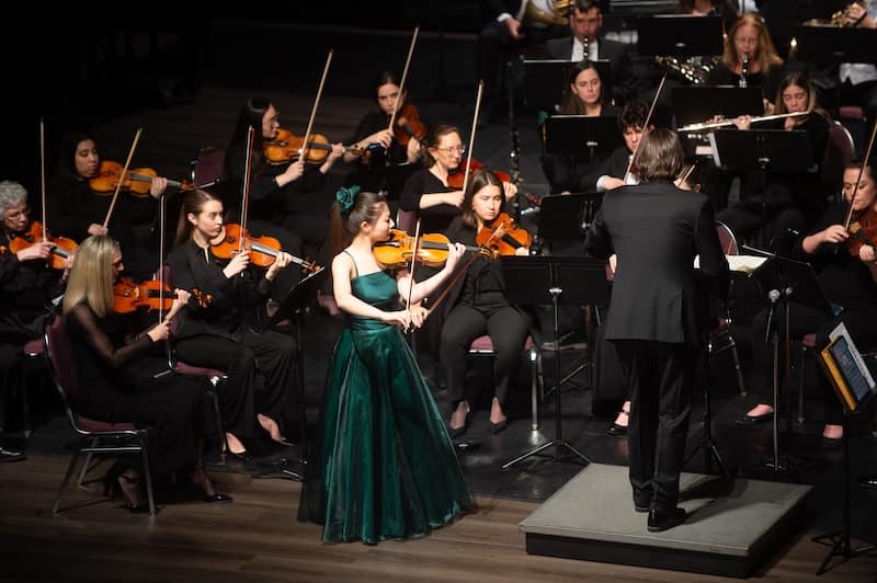 Violinist Sophia Werner was awarded First Prize and also received the Audience Prize following her performance of Samuel Barber’s Violin Concerto. Violinist Mio Imai received Second Prize for her performance of Antonín Dvořák’s Violin Concerto, and pianist Brielle Perez received Third Prize after performing Wolfgang Amadeus Mozart’s Piano Concerto No. 25 in C Major.