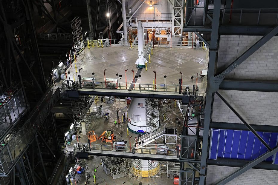 Teams stacked NASA’s Orion spacecraft with its launch abort system on the agency’s SLS rocket in High Bay 3 of the Vehicle Assembly Building at NASA Kennedy on Oct. 20 for the agency’s Artemis II mission. Teams will begin conducting a series of verification tests ahead of rolling out the integrated SLS rocket to Launch Complex 39B for the wet dress rehearsal.
